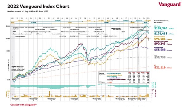 The chart below shows the Australian share market has produced an average annual return of 9.0 per cent since 1992. To help preserve capital and generate longer term capital growth along with income, the latest Vanguard chart underscores the importance of growing a built to last retirement plan and having good asset diversification, even in retirement.